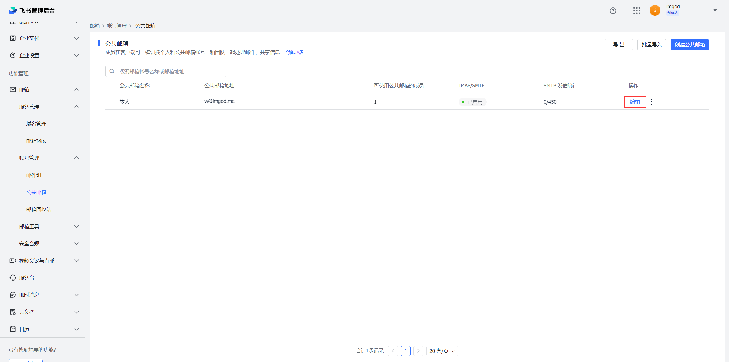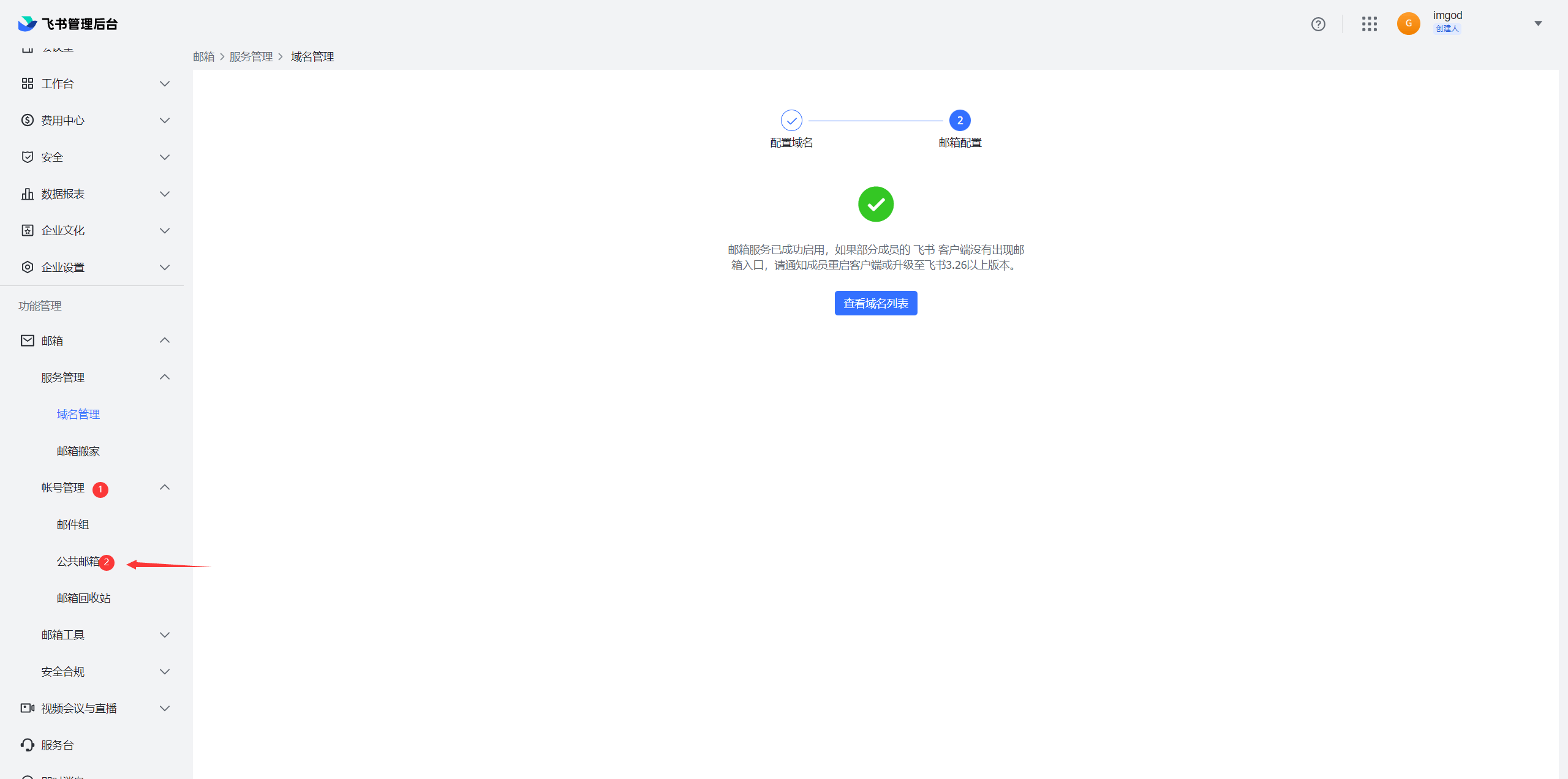 开通公共邮箱,进入公共邮箱配置界面