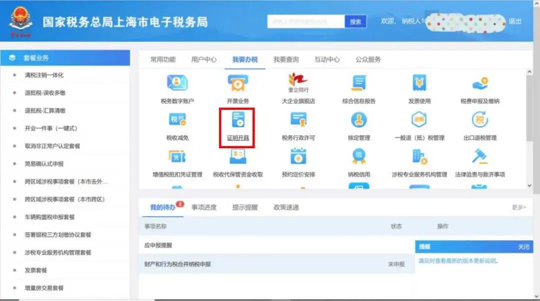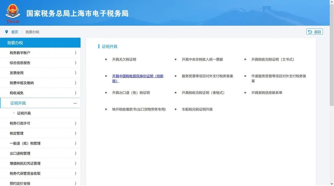 点击电子税务局——我要办税——证明开具——开具中国税收居民身份证明(创新版)
