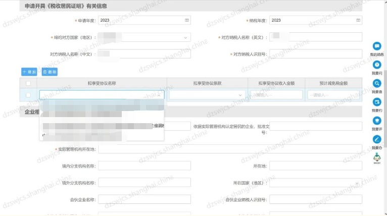 3.选择申请年度、纳税年度、缔约对方国家(地区)、对方纳税人英文名称、缔约对方纳税人识别号;4.选择拟享受协议名称、拟享受协议条款;