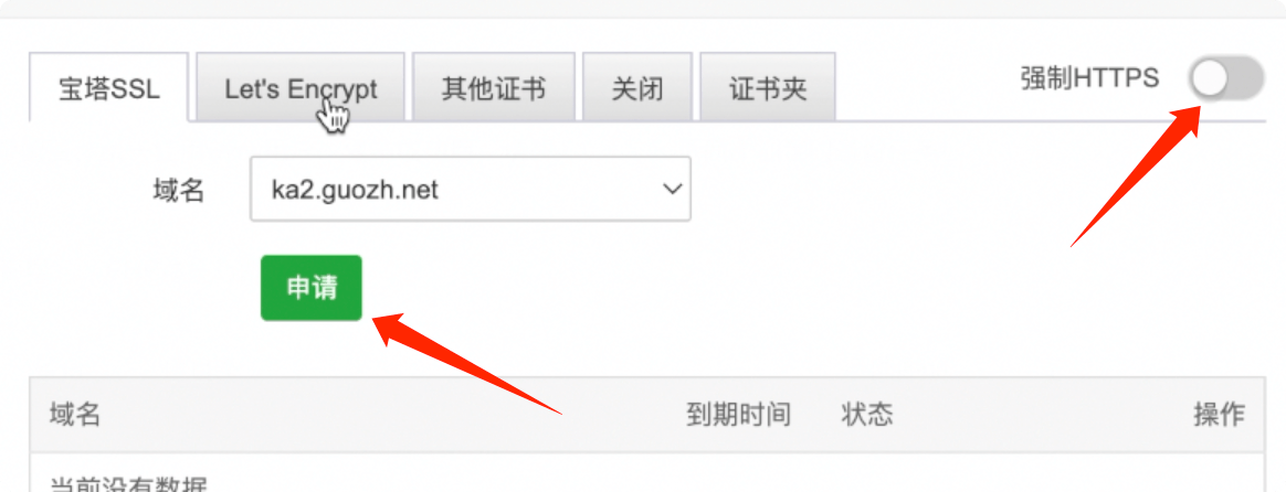 如果没有证书,可以在宝塔申请证书,如果有的话,比如在阿里云、腾讯云申请了免费的证书,可以将证书内容粘贴在【其他证书】。