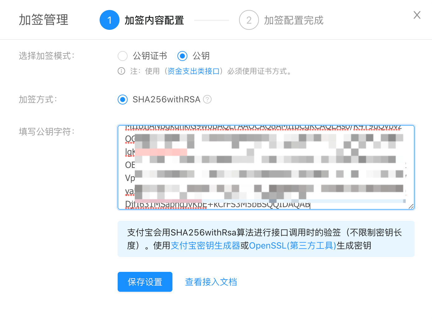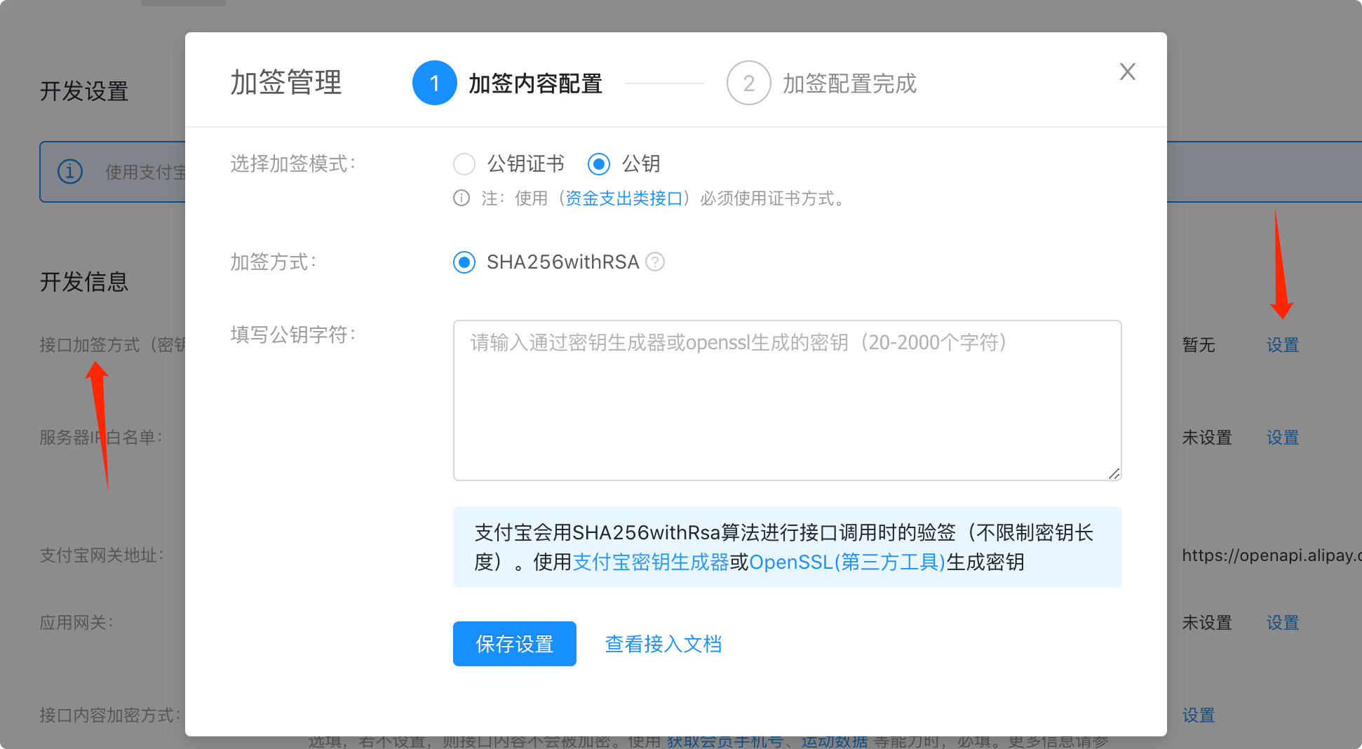 找到接口加签方式,点击设置,显示如下。