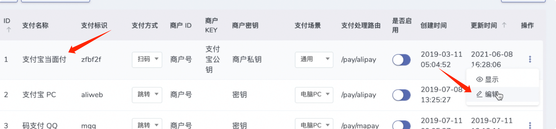 网站后台,找到支付宝当面付,点击编辑。