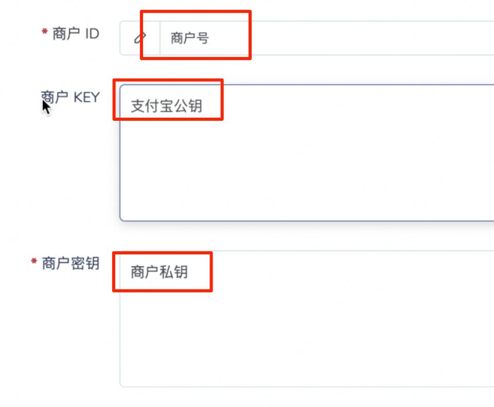商户 ID 就是刚才的支付宝应用的 APPID 、商户 KEY 是上面申请下来的支付宝公钥,商户密钥是用申请起生成的商户私钥,就是电脑本地的应用私钥,不是支付宝网站的应用公钥,注意别搞错了。